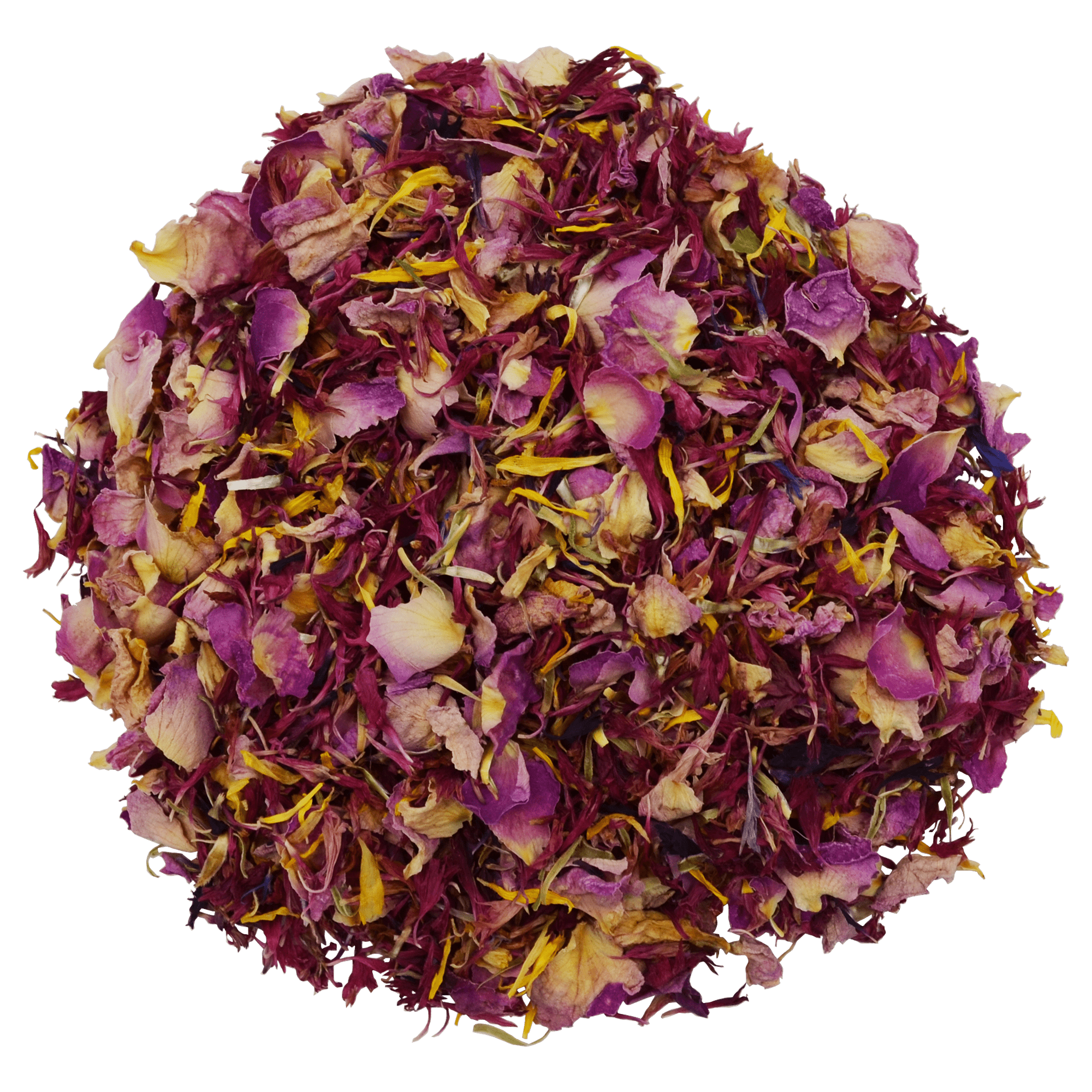 - Hỗn hợp những cánh hoa hồng Damask, hoa ngô và hoa cúc vạn thọ được lựa chọn cẩn thận.